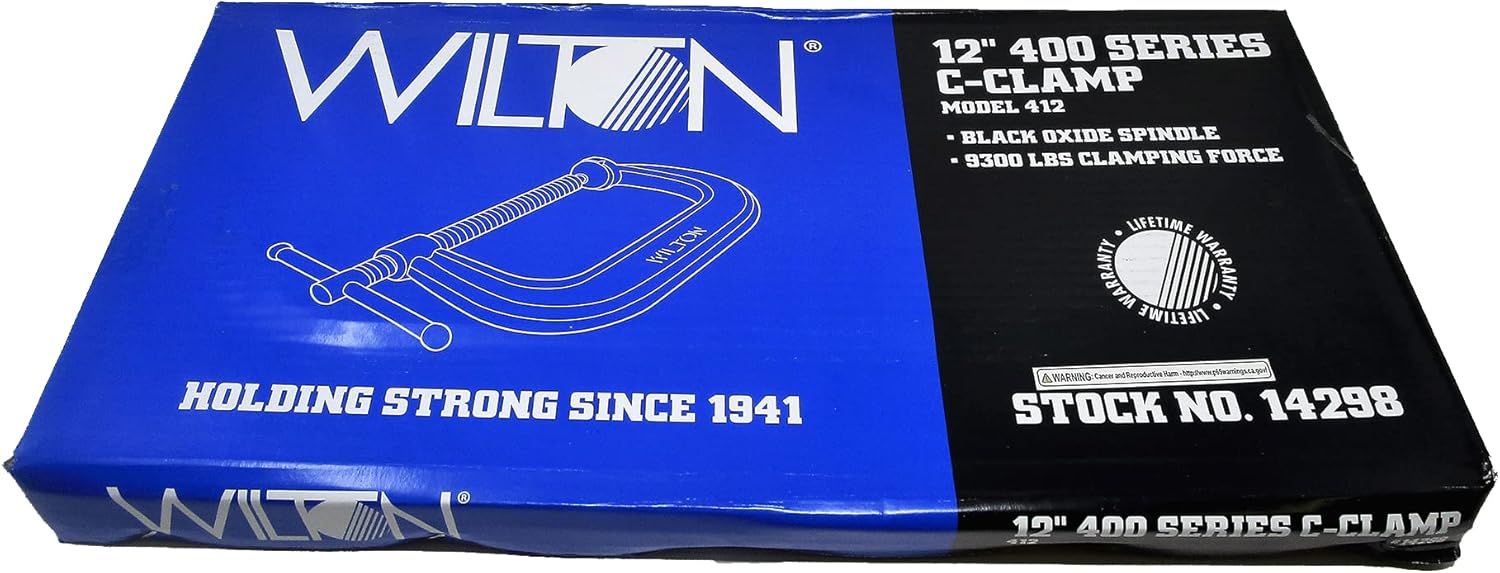 The Wilton 400 Series C-Clamp, MPN 14298, is a valuable tool for various clamping applications. This clamp features a 12-1/4 inch jaw opening and a 6-1/4 inch throat depth for handling large materials. Its drop-forged steel frame ensures durability and strength, essential for heavy-duty tasks.
