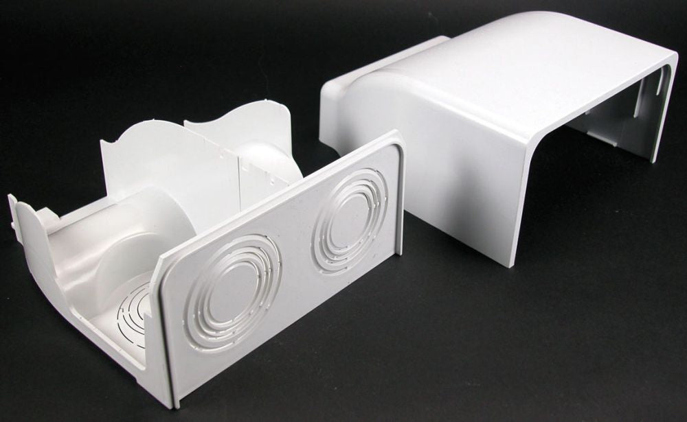 Wiremold 5410DFO-WH is a nonmetallic fiber ready entrance end for the 5400 Series raceway. This product efficiently feeds the raceway while allowing for versatility in installation. The design includes a knockout feature that accommodates various trade sizes, making it suitable for different wiring needs.