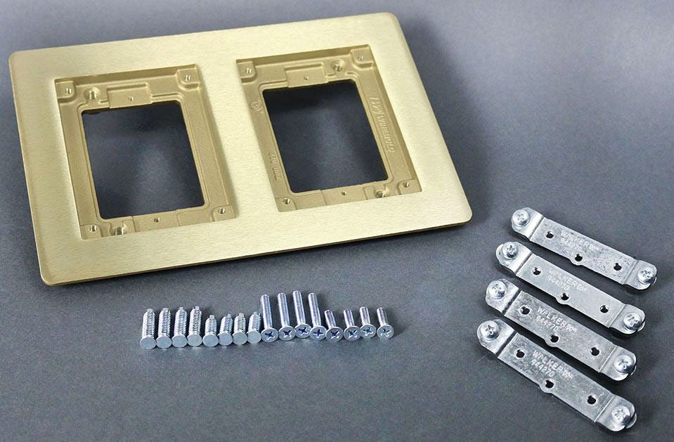 The Wiremold 827B is a two-gang brass combination carpet and tile flange with dimensions of six point zero eight inches by nine point one eight five inches. This flange is suitable for use with OmniBox and Modulink series floor boxes. It is compatible with Ortronics MAB6TJ TracJack and MAB3S2 Series II, as well as Wiremold CM Series Open System adapters. These adapters are sold separately.