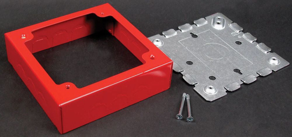 The Wiremold R5752 is a steel alarm device box designed for surface mounting. This product is suitable for alarm devices and safety signals and can fit into four-inch square back boxes. Its cover features three twistouts on each side for easy installation. The base accommodates half-inch and one-inch concentric knockouts and single-gang boxes, making it versatile for various setups.