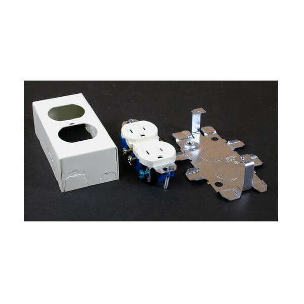 The Wiremold V57243G is a duplex grounding receptacle and box designed for use with 500 and 700 series raceways. This model features dimensions of four and one-eighth inches in length, two inches in width, and one and three-eighth inches in height. Constructed from steel with a ScuffCoat finish, it provides durability and is suitable for various installation environments.