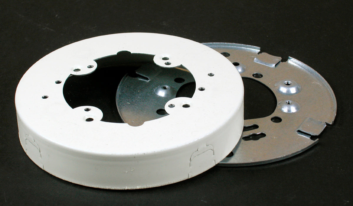 This product features an open design ideal for easy access and installation. It can be mounted onto standard conduit boxes, accommodating different mounting screw centers and providing versatile setup options.