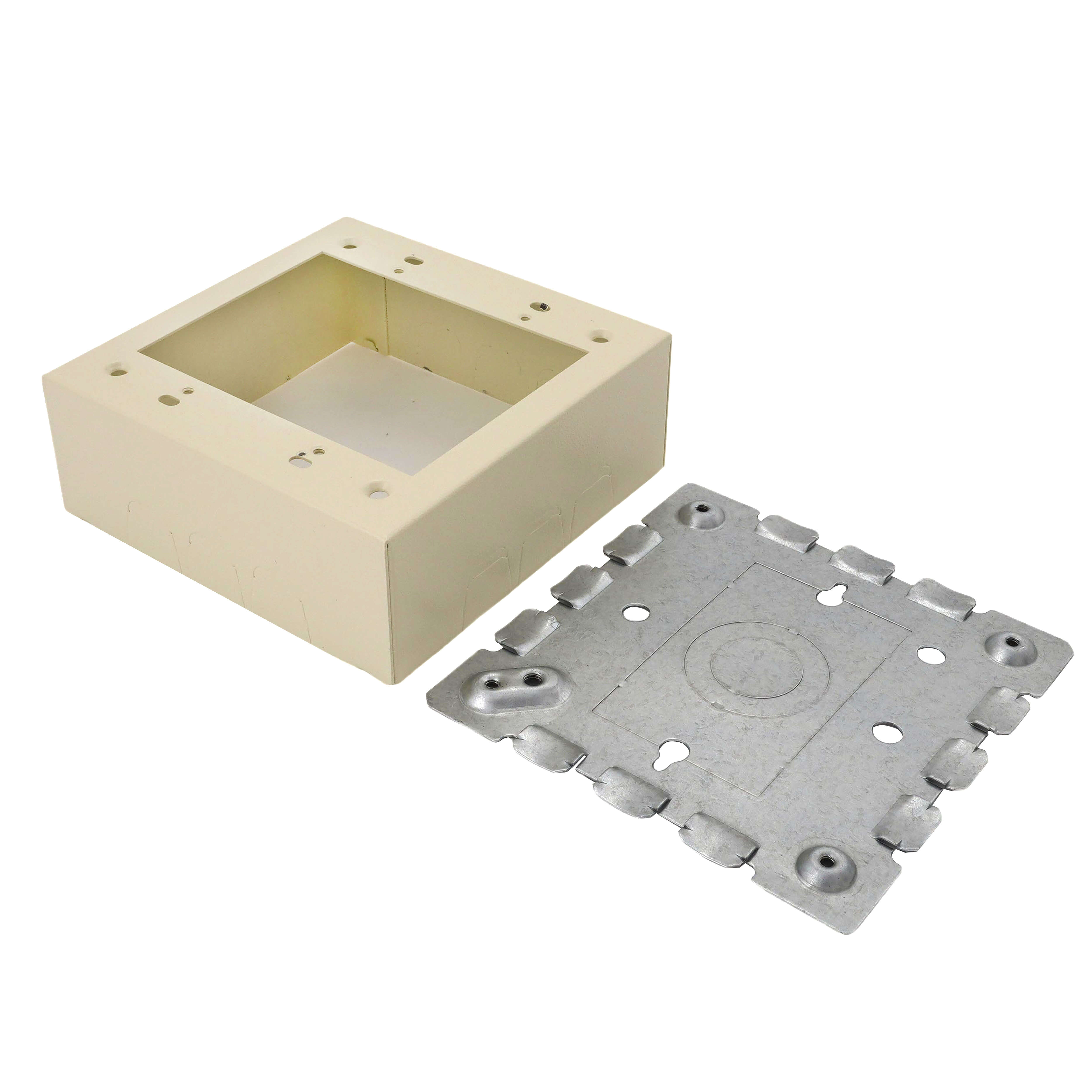The Wiremold Steel Device Box with MPN V5748-2 is suitable for deep switches and receptacles. This two-gang box features two half-inch trade size knockout openings, allowing for easy installation. It is designed to accept NEMA standard double-gang faceplates. The dimensions of the box are four and three-quarters inches by four and three-quarters inches.